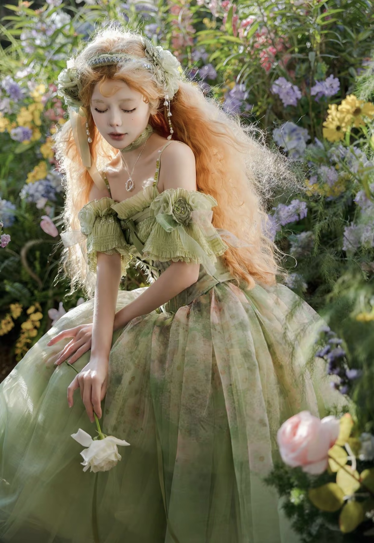 Full set: shirt , skirt, flower headband, necklace, sleeves, flower clip