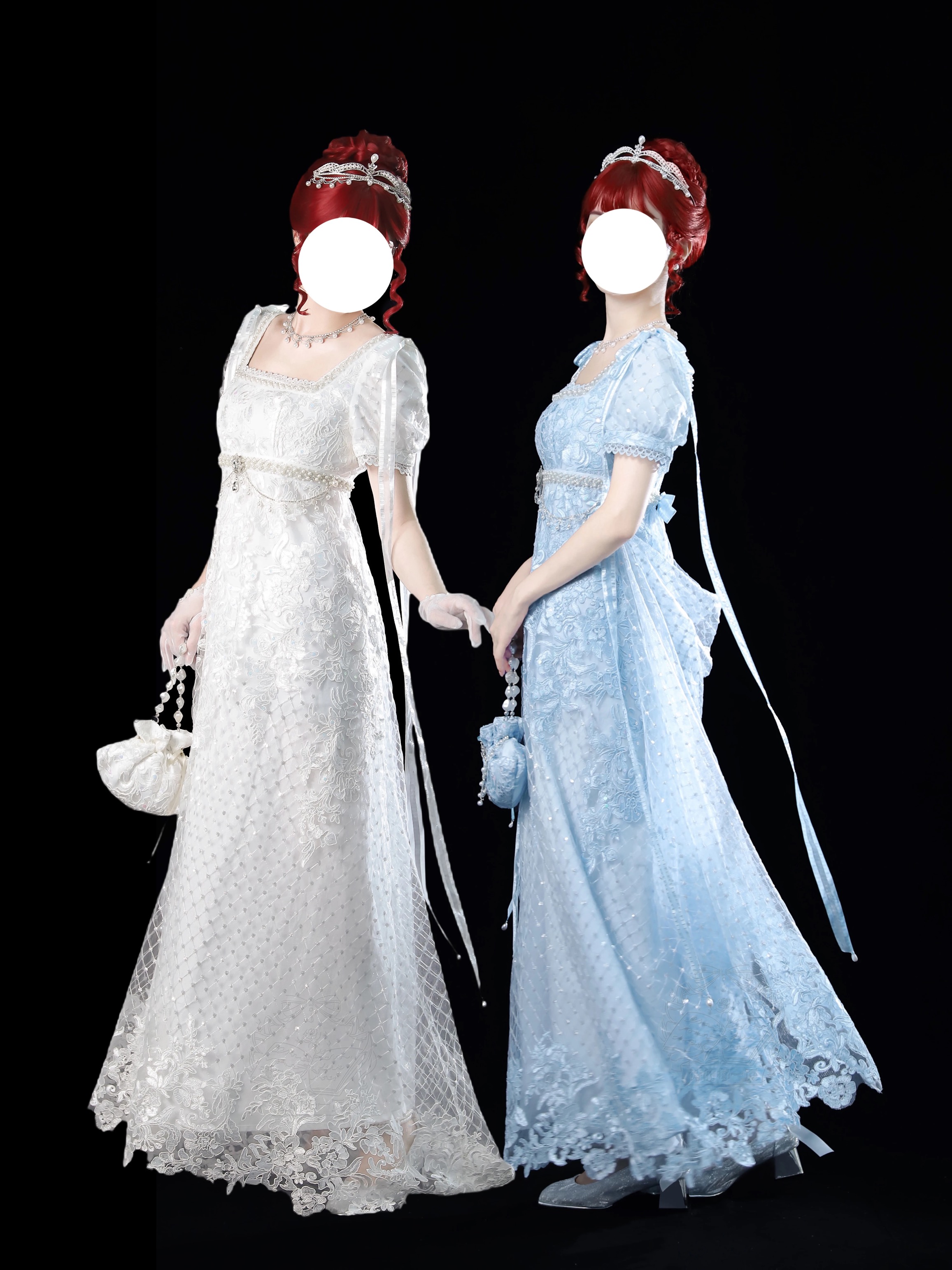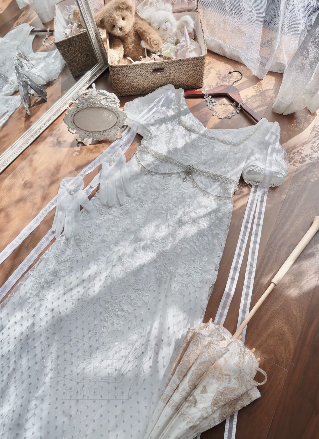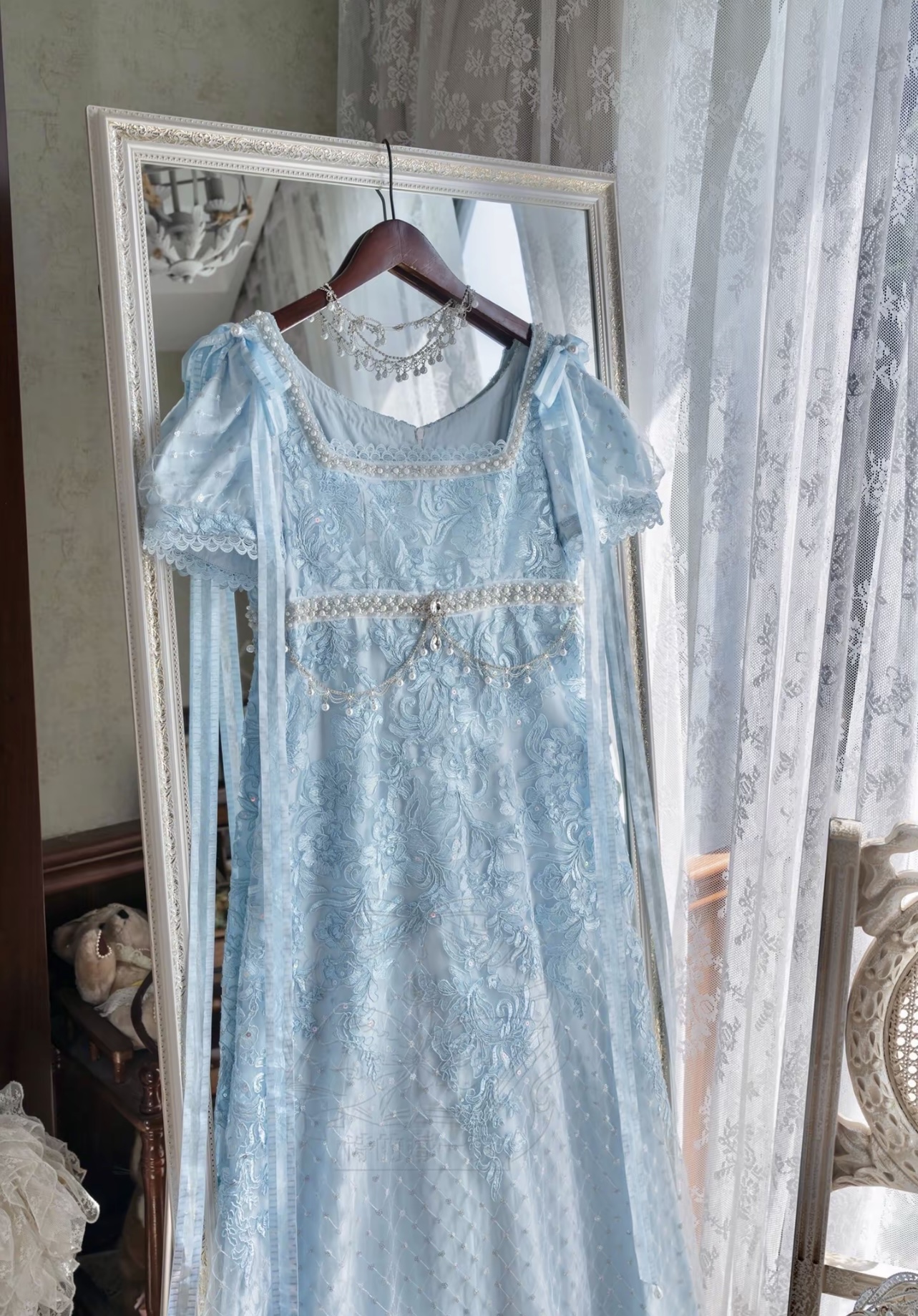 The lining is made from 140g pure cotton, not at all visible even when wearing light-colored underwear, creating a soft and comfortable feeling when in contact with the skin. The design is shorter in the front and longer in the back, with a gorgeous skirt with a ribbon loop at the back that can be hooked to the pearl buckle on the left waist, making it easier for everyday wear. The fabric mostly gathers at the hips when lifted, creating a beautiful S-curve from the side. Hidden back zipper comes from YKK, soft and smooth. All accessories on the dress are removable: a long ribbon bow on the shoulder, a small bow on the back waist, a gemstone brooch and a belt chain made of pearls and rhinestones. Many styling options allow you to have a variety of looks. (The jeweled brooch is custom-made and sparkles exquisitely.)