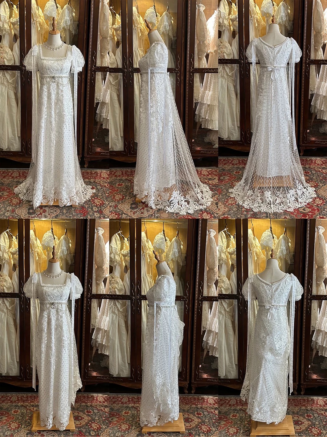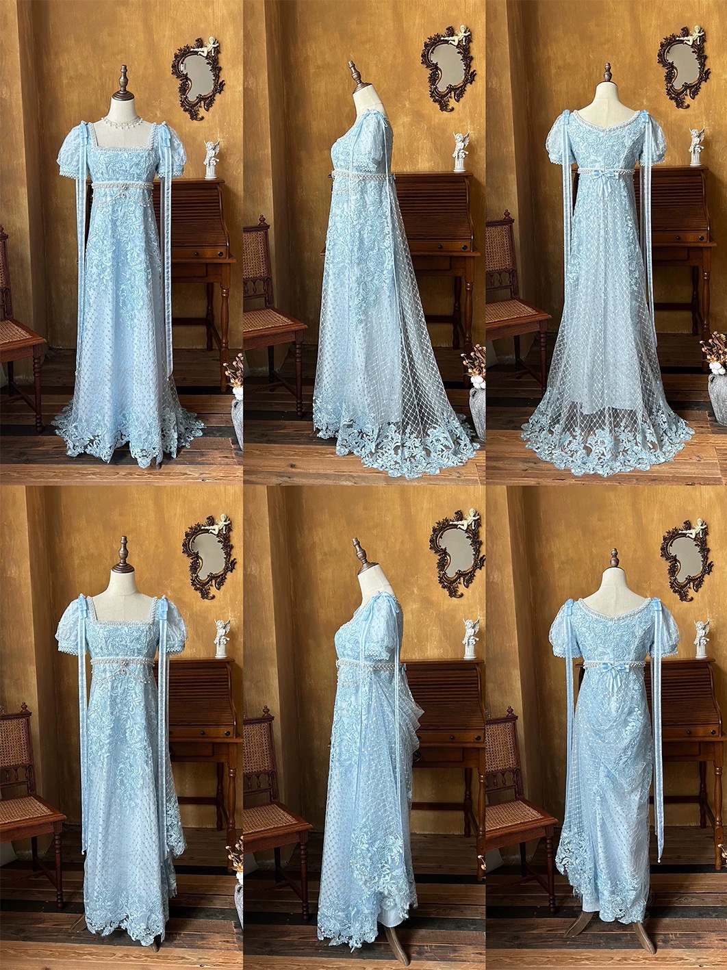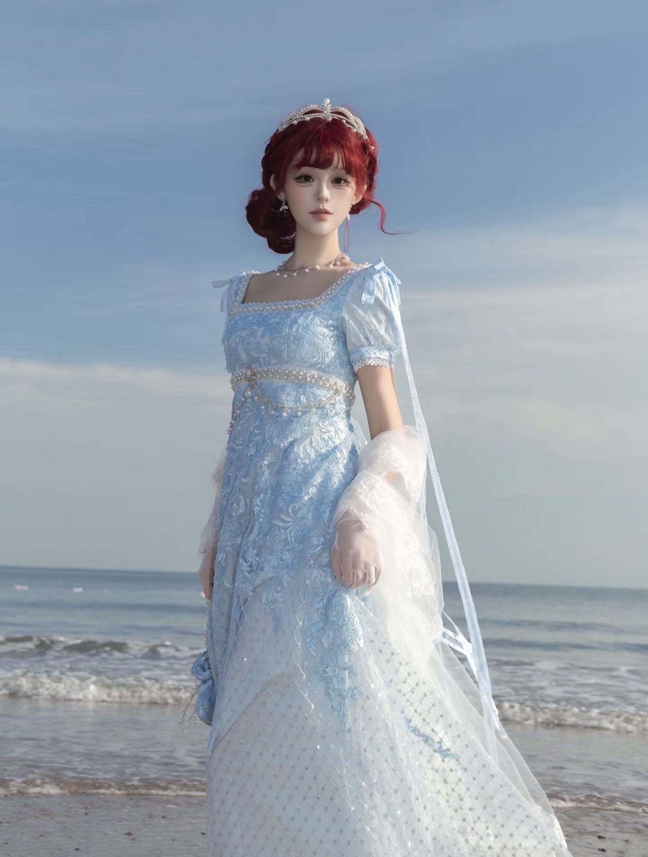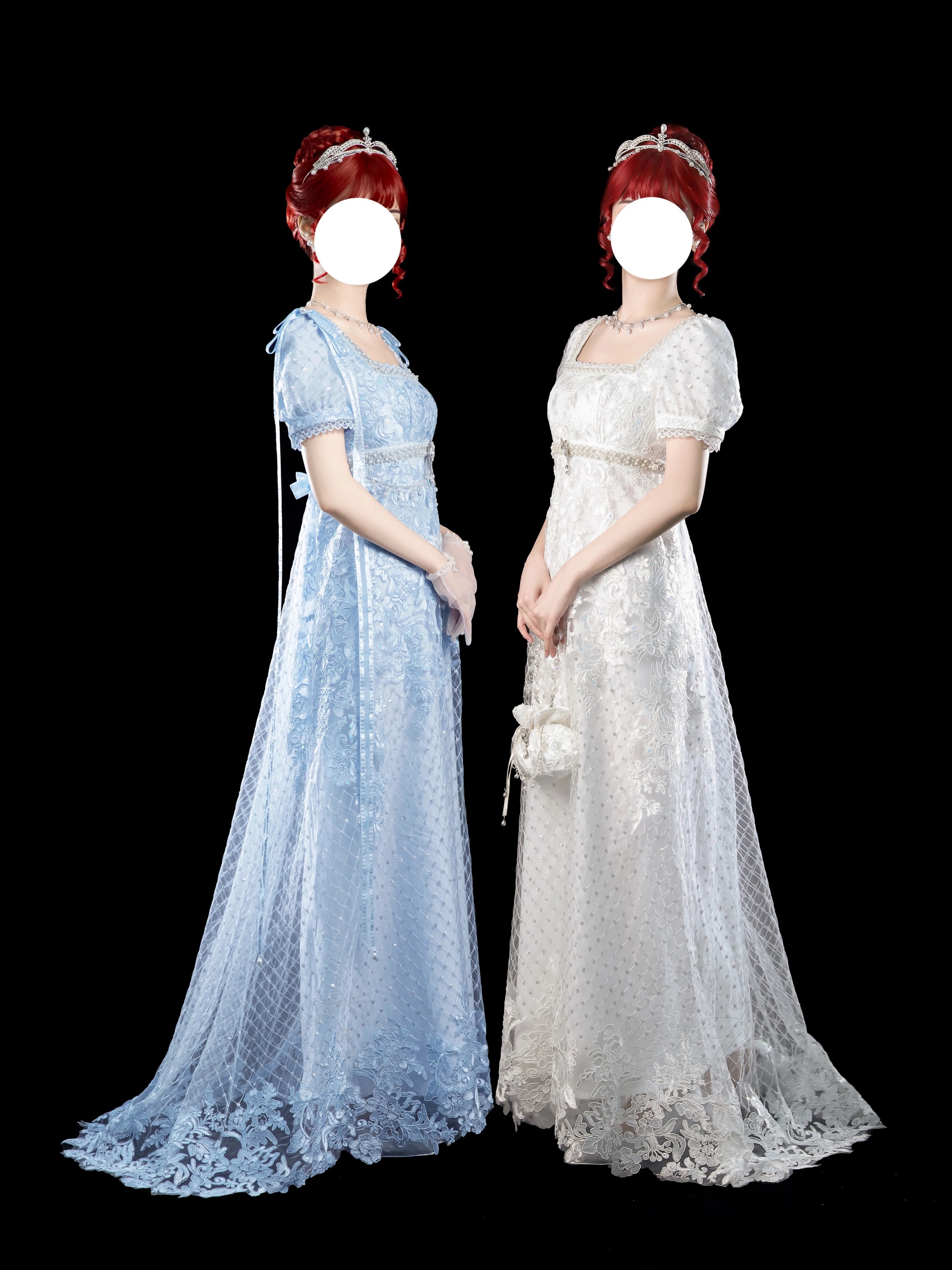 The lining is made from 140g pure cotton, not at all visible even when wearing light-colored underwear, creating a soft and comfortable feeling when in contact with the skin. The design is shorter in the front and longer in the back, with a gorgeous skirt with a ribbon loop at the back that can be hooked to the pearl buckle on the left waist, making it easier for everyday wear. The fabric mostly gathers at the hips when lifted, creating a beautiful S-curve from the side. Hidden back zipper comes from YKK, soft and smooth. All accessories on the dress are removable: a long ribbon bow on the shoulder, a small bow on the back waist, a gemstone brooch and a belt chain made of pearls and rhinestones. Many styling options allow you to have a variety of looks. (The jeweled brooch is custom-made and sparkles exquisitely.)